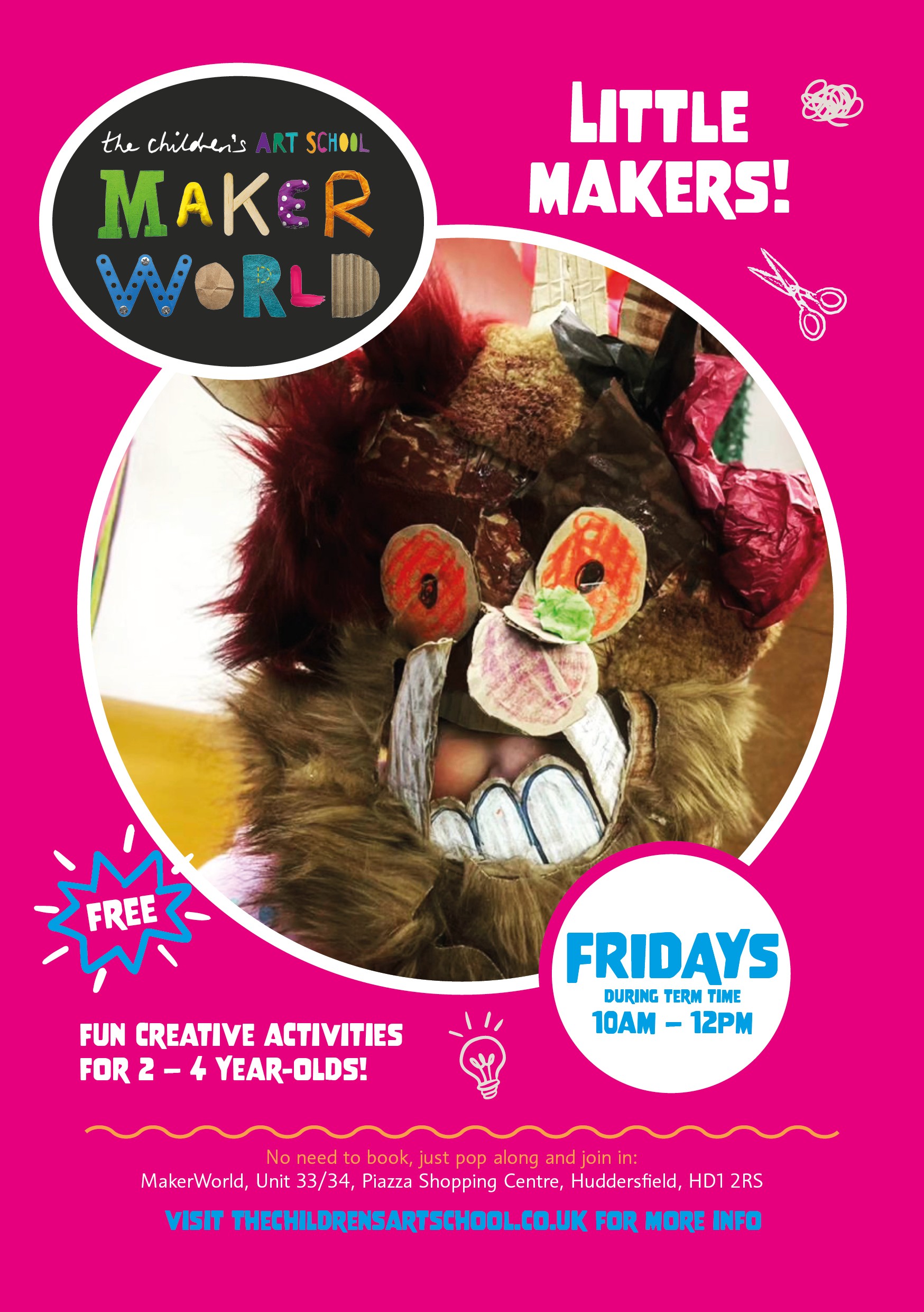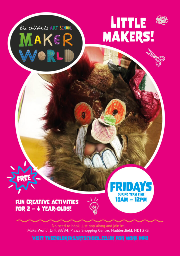 Our weekly free, drop-in sessions in Huddersfield’s Piazza Centre and Dewsbury Princess of Wales precinct (Saturdays 11am-3pm), (Little Makers, Huddersfield Fridays 10-12) offer interactive experiences that encourage hands-on engagement with art and extraordinary creative encounters.